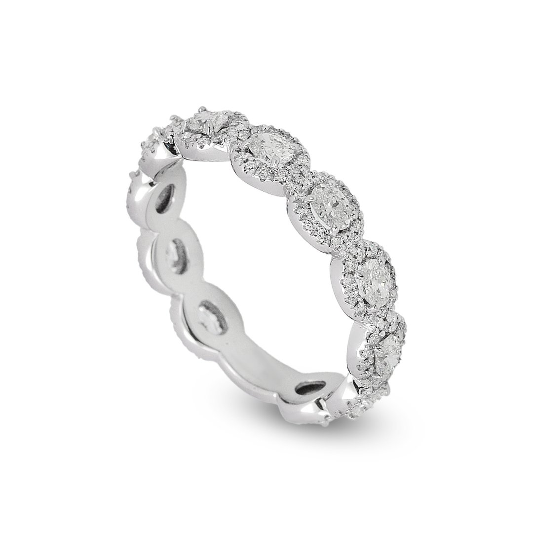 Artisans set each oval with exact care. They align facets to maximize light return. Then they place round brilliants in even spacing. The settings secure stones and preserve a smooth profile. As a result, the band reflects light continuously. Moreover, varied sizes enhance rhythm and subtle contrast.